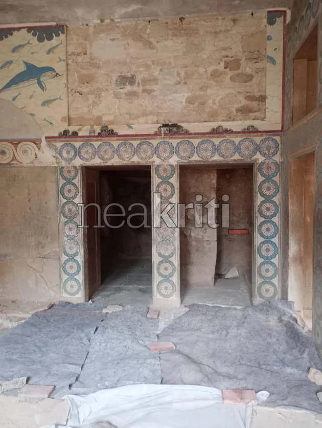 Σύμφωνα με πληροφορίες στο σημείο που υπέστη ζημιά υπήρχε μια τοιχογραφία με τα δελφίνια, ένα αντίγραφο της πρώτης αναστήλωσης που είχε πραγματοποιήσει ο Άρθουρ Έβανς. Αξίζει να σημειωθεί πως το αυθεντικό έργο φυλάσσεται στο Αρχαιολογικό Μουσείο Ηρακλείου.