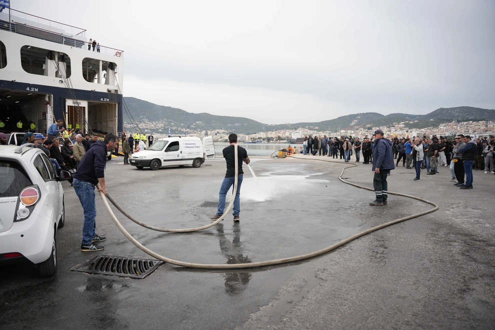 Στην κατάληψη της χερσαίας ζώνης του επιβατικού λιμανιού της Μυτιλήνης προχώρησαν στις 3.30 το μεσημέρι μεγάλες ομάδες κτηνοτρόφων, προσεγγίζοντας με τα αυτοκίνητά τους τον καταπέλτη του πλοίου «ΝΗΣΟΣ ΣΑΜΟΣ» όπου, από μία ώρα πριν, βρίσκονταν και άλλοι κτηνοτρόφοι.