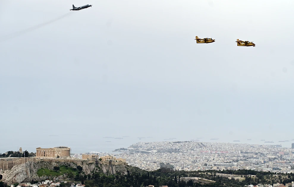 Η κάμερα του Orange Press Agency κατέγραψε μοναδικά πλάνα με φόντο την Ακρόπολη, όπου πέρασαν σε σχηματισμούς μαχητικά αεροσκάφη, ελικόπτερα, μεταγωγικά C-130, καθώς και αεροσκάφη Canadair.