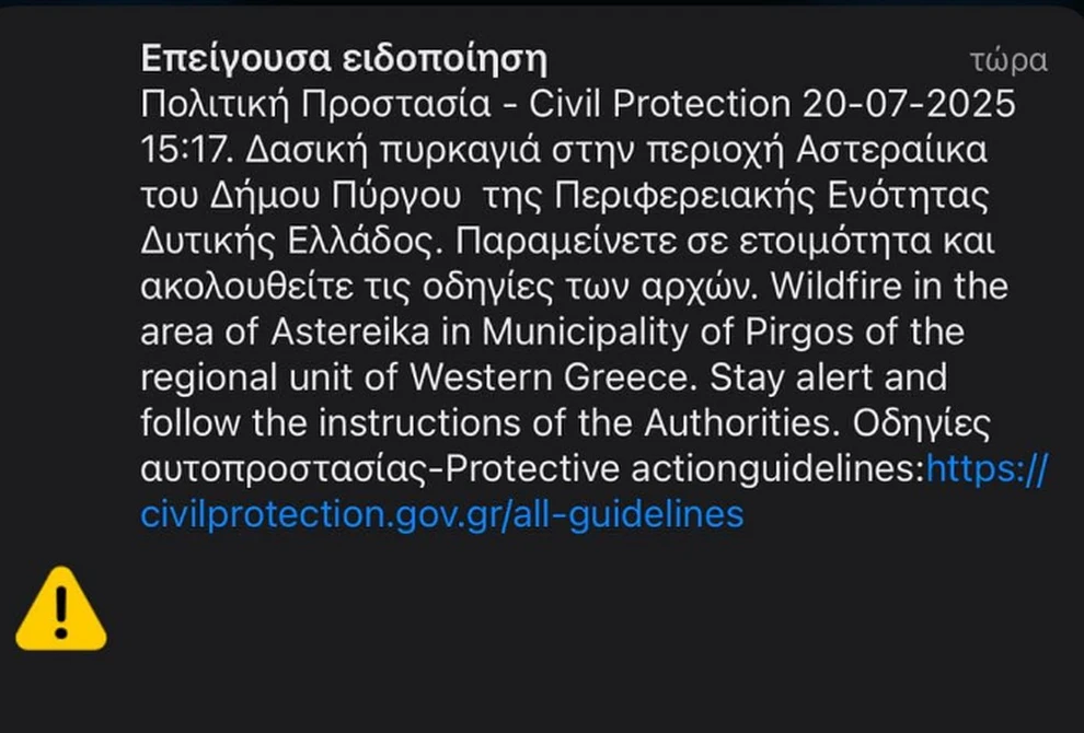 Παράλληλα, εστάλη προειδοποιητικό μήνυμα από το 112 στους κατοίκους της περιοχής, με οδηγίες για προληπτική απομάκρυνση και αυξημένη ετοιμότητα. Οι Αρχές ζητούν από τους πολίτες να ακολουθούν πιστά τις οδηγίες της Πολιτικής Προστασίας και να παραμένουν ψύχραιμοι.