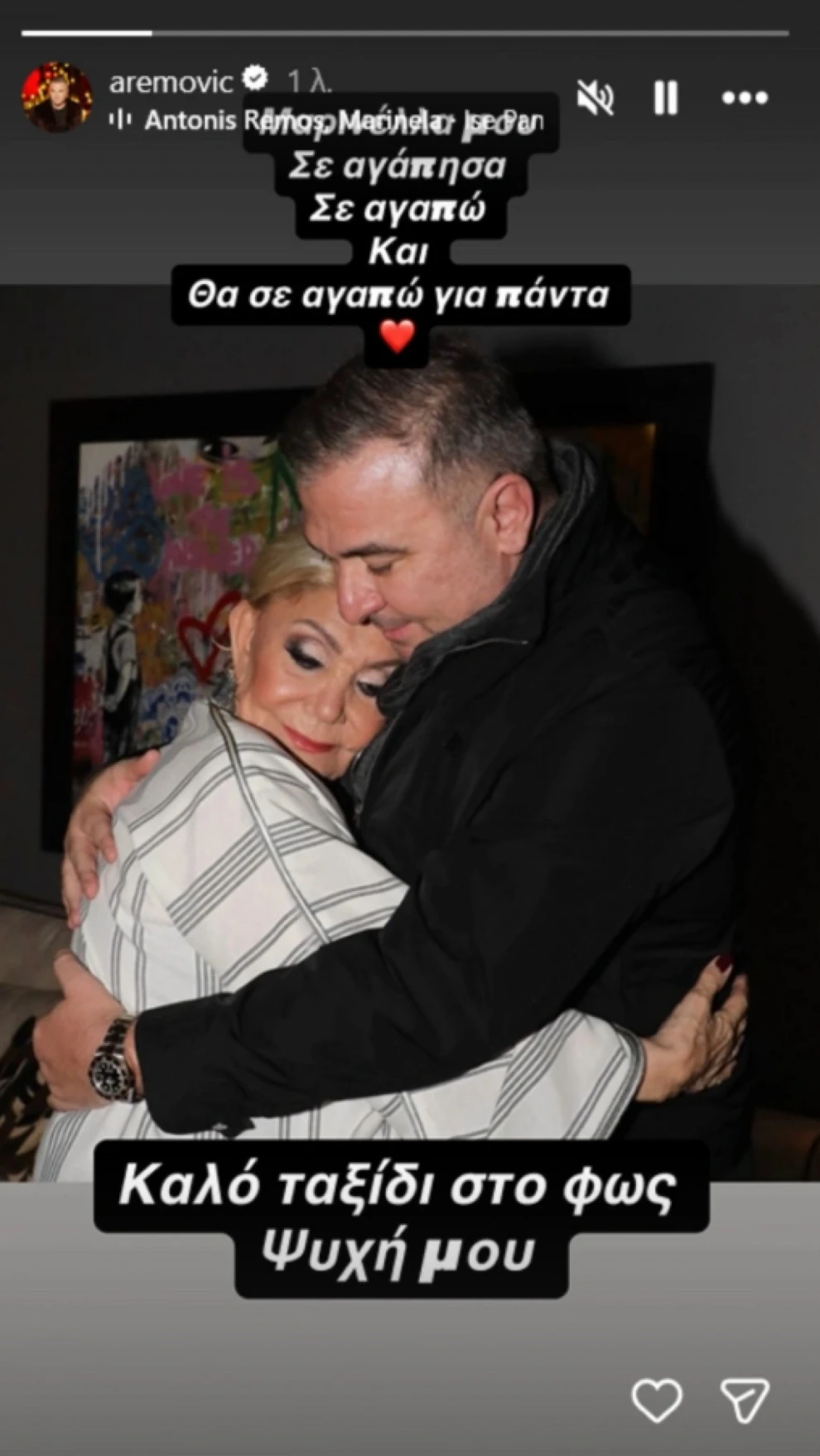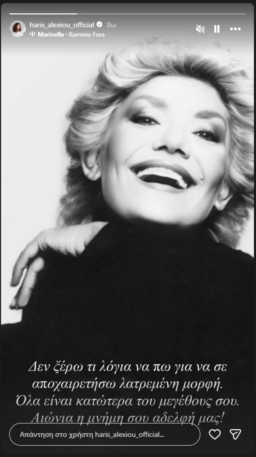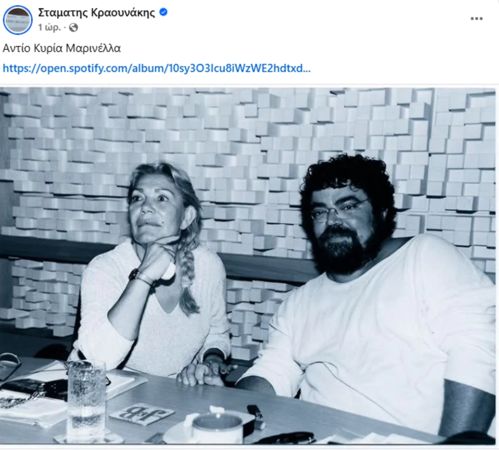 «Θα σε θυμάμαι και θα σε αγαπώ για πάντα. Σπουδαία Μαρινέλλα όλων μας!», έγραψε ο Στέφανος Κορκολής σε δική του ανάρτηση, αναρτώντας φωτογραφία της σπουδαίας ερμηνεύτριας.