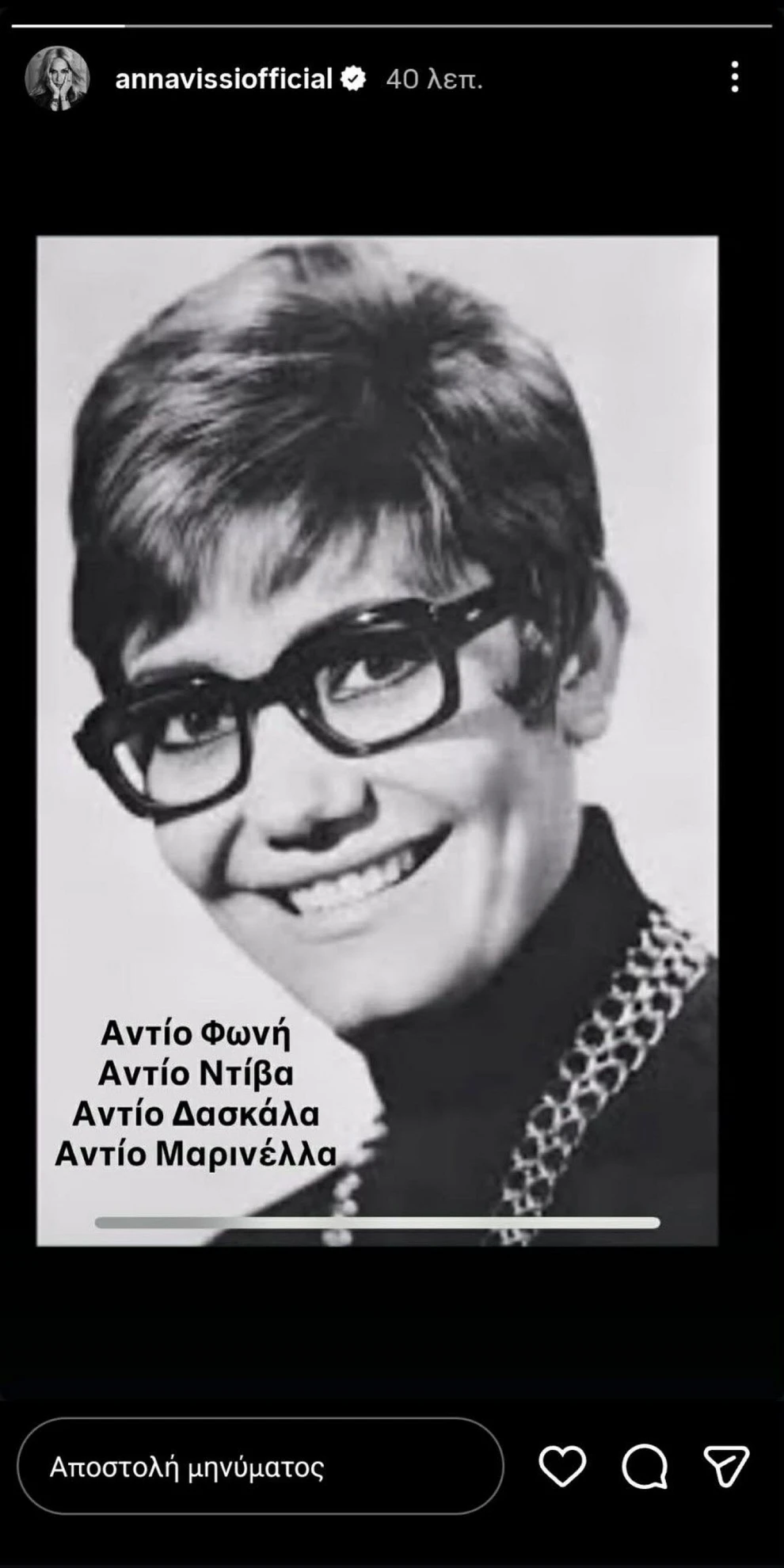 Η Άννα Βίσση επέλεξε έναν απόλυτα λιτό και προσωπικό τρόπο για να πει το δικό της «αντίο». Ανέβασε μια ασπρόμαυρη φωτογραφία της Μαρινέλλας από τα νεανικά της χρόνια, πάνω στην οποία έγραψε: «Αντίο φωνή, αντίο ντίβα, αντίο δασκάλα, αντίο Μαρινέλλα».