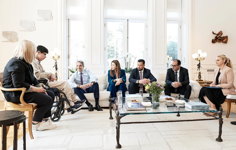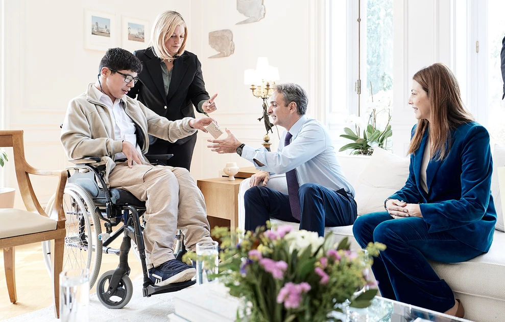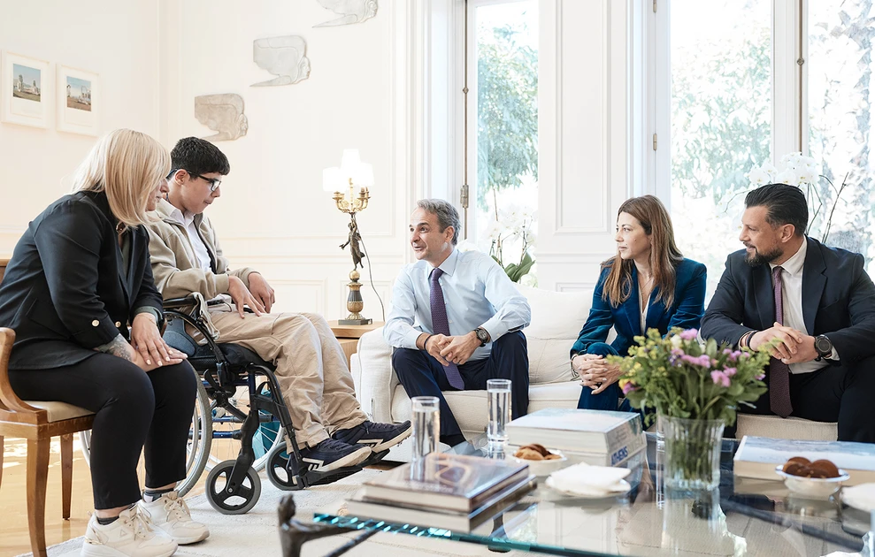 Ο Κυριάκος Μητσοτάκης συναντήθηκε στο Μέγαρο Μαξίμου με τον μαθητή της Β’ Γυμνασίου του Ειδικού Γυμνασίου-Λυκείου Αθηνών στην Ηλιούπολη, Παναγιώτη, ο οποίος απέστειλε πρόσφατα επιστολή στον πρωθυπουργό ζητώντας τη συνδρομή του στην αναβάθμιση των εγκαταστάσεων του σχολείου και των παρεχόμενων υπηρεσιών για παιδιά με αναπηρία.