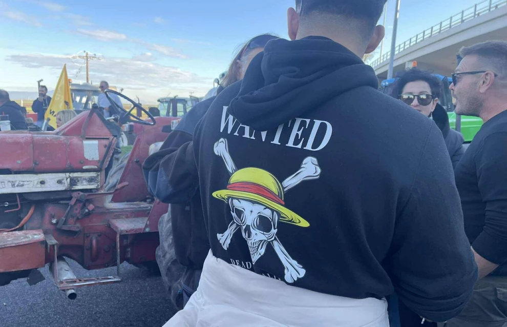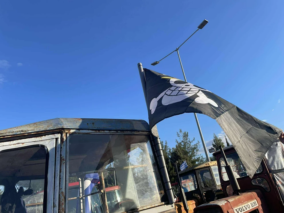 Με τη σημαία του «One Piece» στο τρακτέρ του κατέβηκε ένας νεαρός αγρότης, χθες, στο μπλόκο της Νίκαιας, στη Λάρισα.
