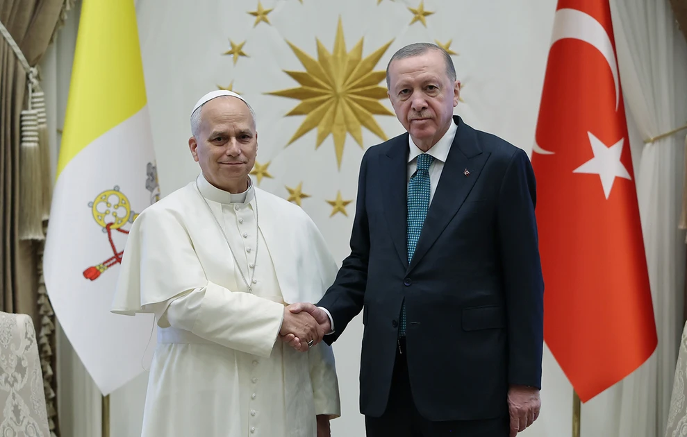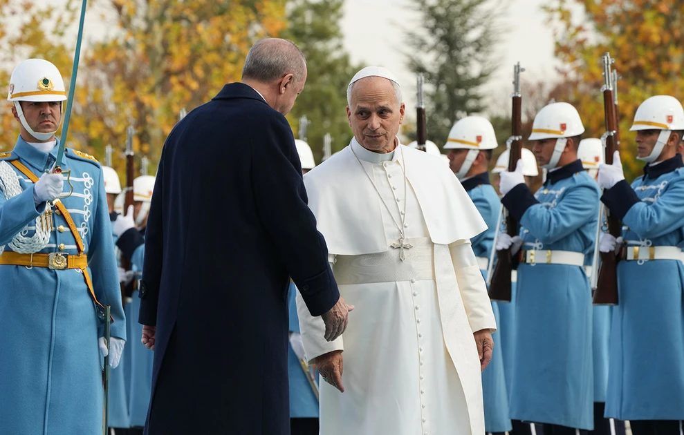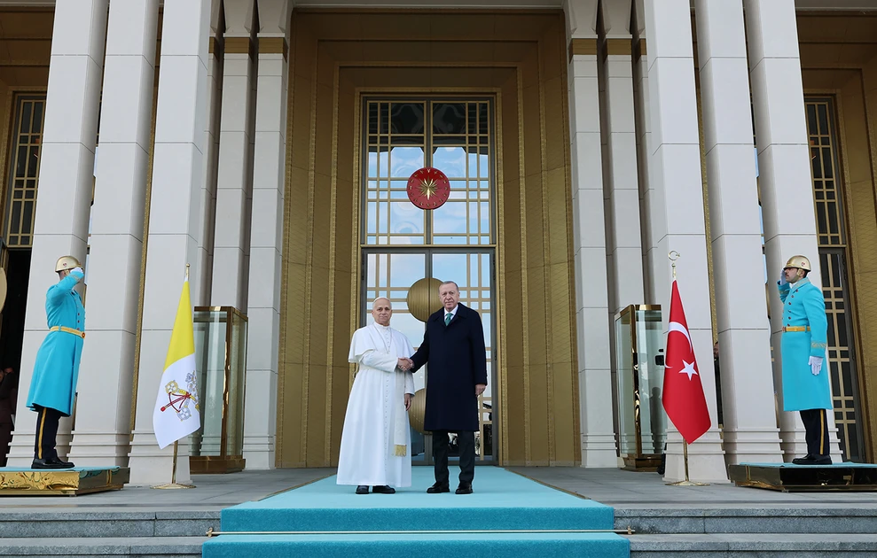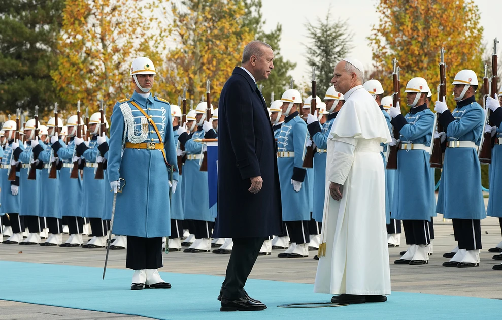 Ο Ρετζέπ Ταγίπ Ερντογάν υποδέχτηκε την Πέμπτη τον Πάπα Λέοντα ΙΔ‘ στο Προεδρικό Συγκρότημα, στην Άγκυρα, σε μια επίσημη τελετή με στρατιωτικές τιμές, στην οποία έλαβαν μέρος υψηλόβαθμοι αξιωματούχοι της κυβέρνησης της Τουρκίας.