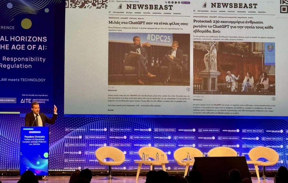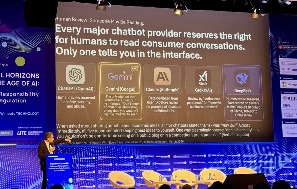 Εμπιστεύεστε τυφλά το Chatbot σας; Λέτε τα πάντα στο ChatGPT, στο Gemini, το DeepSeek ή τα άλλα προγράμματα τεχνητής νοημοσύνης; Χμ… Ίσως θα πρέπει να το ξανασκεφτείτε. Τουλάχιστον όσοι παρακολούθησαν τη σημερινή άκρως κατατοπιστική ομιλία του καθηγητή Διεθνούς, Ευρωπαϊκού και Ψηφιακού Δικαίου στο γαλλικό Πανεπιστήμιο Grenoble Alpes όπου κατέχει την έδρα Responsible AI και Διευθυντή του φημισμένου Κέντρου Διεθνούς Ασφάλειας και Ευρωπαϊκών Σπουδών (CESICE), του κ. Θεόδωρου Χριστάκη, έφυγαν προβληματισμένοι για το εάν και κατά πόσο θα πρέπει να είμαστε τόσο διαχυτικοί στις γραπτές ή προφορικές συνομιλίες που έχουμε με τέτοιου είδους προγράμματα Τεχνικής Νοημοσύνης (AI).