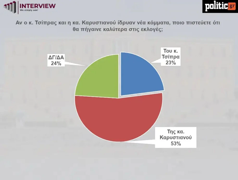 Τα αποτελέσματα έδειξαν πως το υποθετικό κόμμα της Μαρίας Καρυστιανού συγκεντρώνει 53%, υπερδιπλάσιο ποσοστό σε σχέση με το 23% που αποδίδεται στο αντίστοιχο του Αλέξη Τσίπρα.
