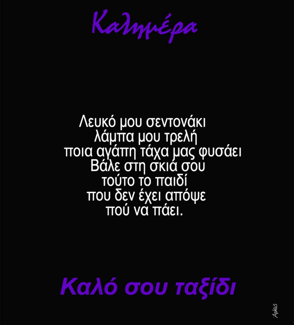 Σε μαύρο φόντο, υπάρχουν οι εξής στίχοι: