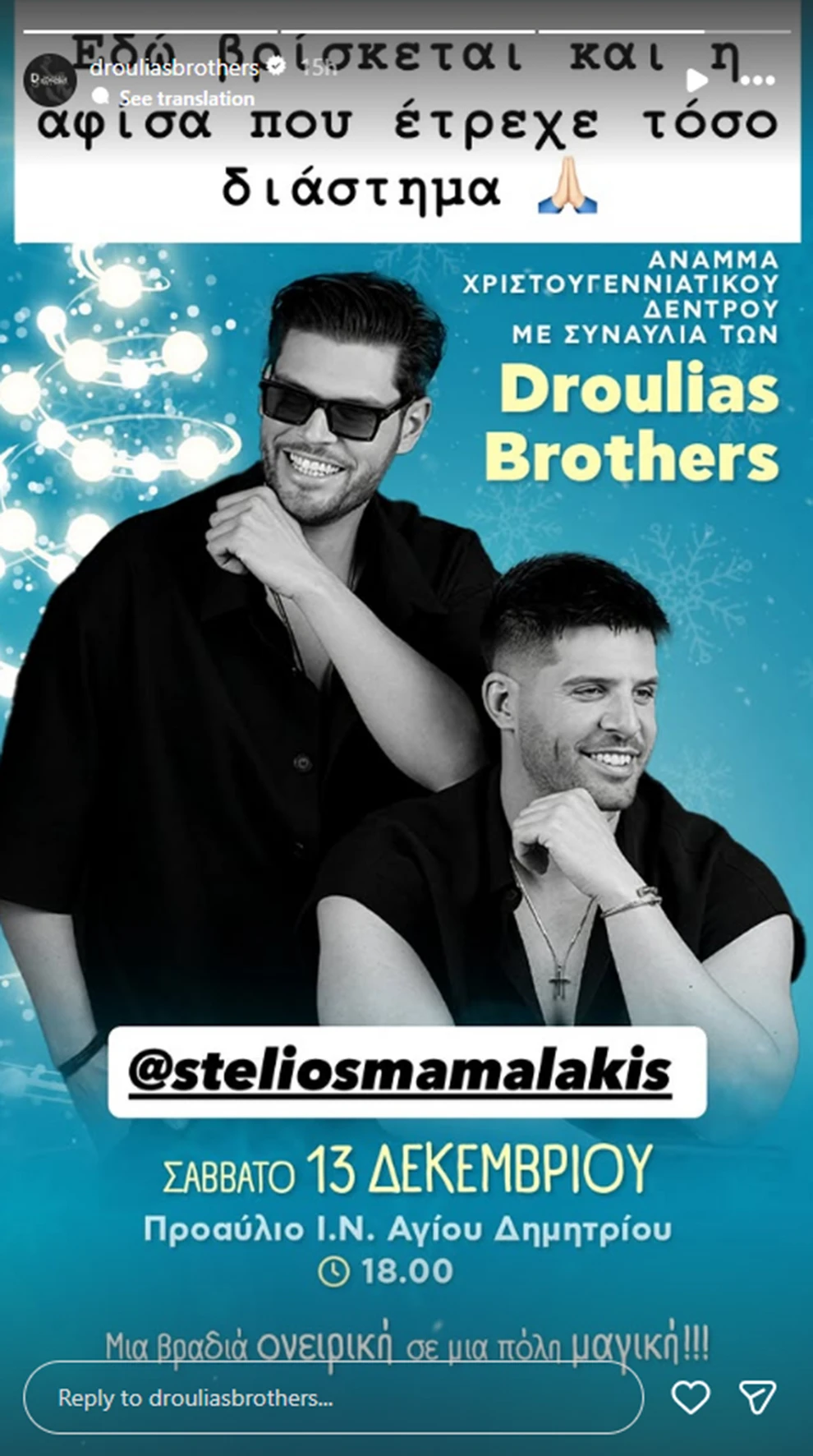 Ο Δήμος Αγίου Δημητρίου ακύρωσε την προγραμματισμένη για τις 13 Δεκεμβρίου συναυλία των Droulias Brothers, με αφορμή το άναμμα του χριστουγεννιάτικου δέντρου της περιοχής.
