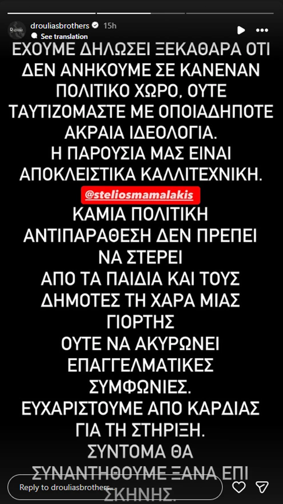Σε δεύτερη ανάρτηση έγραψαν ότι «έχουμε δηλώσει ξεκάθαρα ότι δεν ανήκουμε σε κανέναν πολιτικό χώρο. Ούτε ταυτιζόμαστε με οποιαδήποτε ακραία ιδεολογία. Η παρουσία μας είναι αποκλειστικά καλλιτεχνική. Καμία πολιτική αντιπαράθεση δεν πρέπει να στερεί από τα παιδιά και τους δημότες τη χαρά μιας γιορτής ούτε να ακυρώνει επαγγελματικές συμφωνίες. Ευχαριστούμε από καρδιάς για τη στήριξη. Σύντομα θα συναντηθούμε ξανά επί σκηνής».