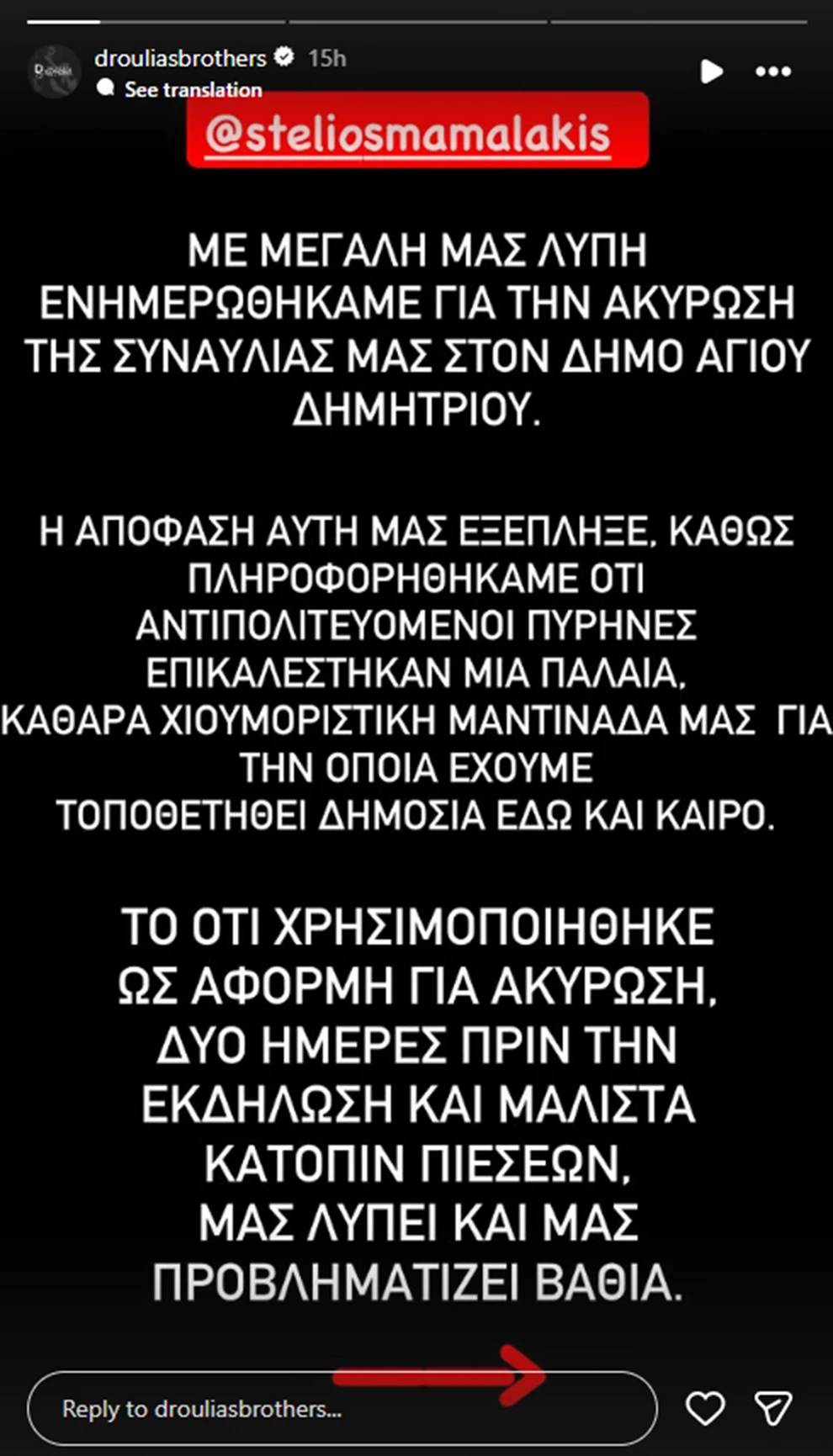 Το συγκρότημα σε ανάρτησή του στο Instagram ανέφερε: «Με μεγάλη μας λύπη ενημερωθήκαμε για την ακύρωση της συναυλίας μας στον δήμο Αγίου Δημητρίου. Η απόφαση αυτή μας εξέπληξε καθώς πληροφορηθήκαμε ότι αντιπολιτευόμενοι πυρήνες επικαλέστηκαν μια παλαιά καθαρά χιουμοριστική μαντινάδα μας για την οποία έχουμε τοποθετηθεί δημόσια εδώ και καιρό. Το ότι χρησιμοποιήθηκε ως αφορμή για ακύρωση, δύο ημέρες πριν την εκδήλωση και μάλιστα κατόπιν πιέσεων, μας λυπεί και μας προβληματίζει βαθιά».
