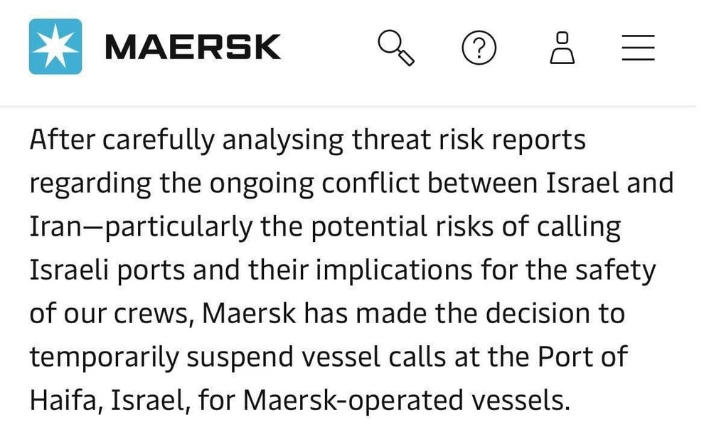 Η ναυτιλιακή εταιρεία μεταφοράς εμπορευματοκιβωτίων Maersk (MAERSKb.CO) ανακοίνωσε την Παρασκευή ότι διακόπτει προσωρινά τις προσεγγίσεις πλοίων της στο λιμάνι της Χάιφα στο Ισραήλ, λόγω της κλιμάκωσης της σύγκρουσης της χώρας με το Ιράν.