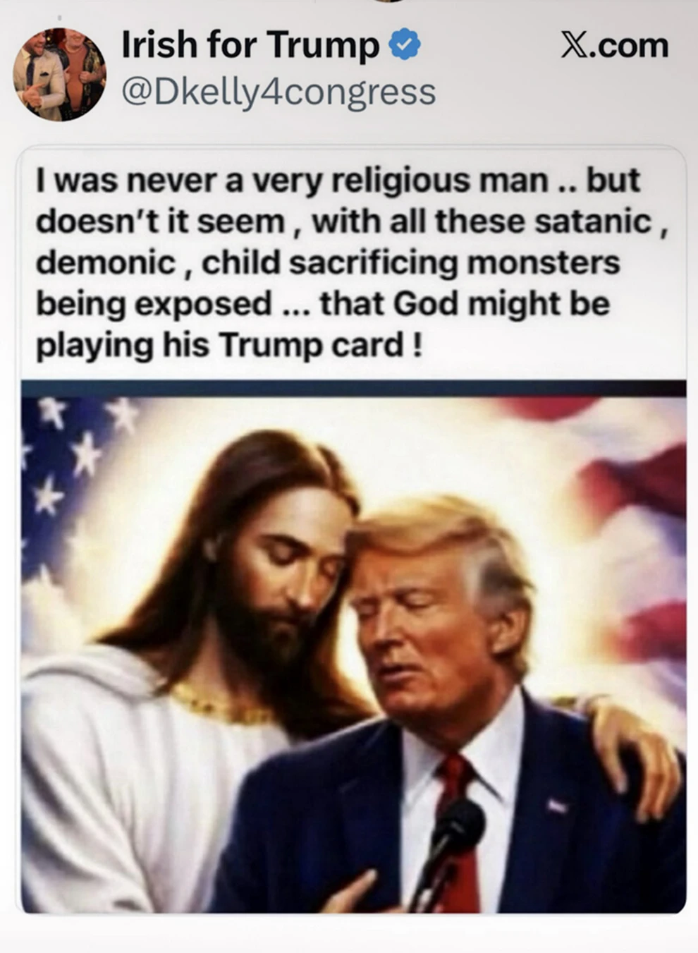 Η εικόνα, που αναδημοσιεύτηκε στον λογαριασμό του Τραμπ στο Truth Social, τον δείχνει με τα μάτια του κλειστά, να κλίνει την κεφαλή προς τον Ιησού. Ο Τραμπ στέκεται πίσω από ένα μικρόφωνο και πίσω του μια αμερικανική σημαία. Η αρχική ανάρτηση είχε τη λεζάντα: «Δεν ήμουν ποτέ ένας ιδιαίτερα θρησκευόμενος άνθρωπος… αλλά δεν φαίνεται, με όλα αυτά τα σατανικά, δαιμονικά, τέρατα που θυσιάζουν παιδιά να αποκαλύπτονται… ότι ο Θεός μπορεί να παίζει το χαρτί Τραμπ!»