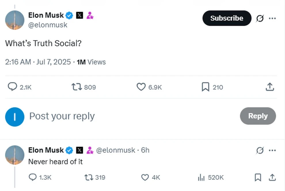 Ο Έλον Μασκ σχολίασε ειρωνικά όσα έγραψε ο Τραμπ στην ανάρτησή του: «Τι είναι το Truth Social; Δεν το έχω καν ακουστά», έγραψε ο ιδιοκτήτης του X για την πλατφόρμα κοινωνικής δικτύωσης του Τραμπ.