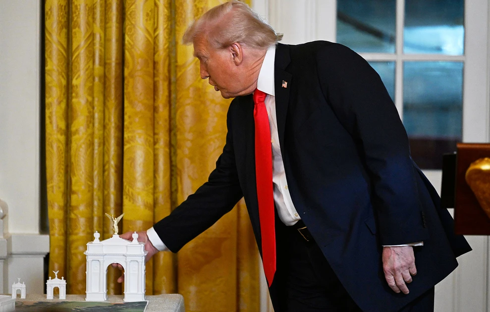 Ο Τραμπ έδειξε επίσης σχέδια για την αψίδα που θέλει να κατασκευάσει κοντά στο μνημείο του Λίνκολν στην Ουάσινγκτον, μια εκδοχή της οποίας έχει διαστάσεις πιο επιβλητικές από αυτές της γαλλικής Αψίδας του Θριάμβου.