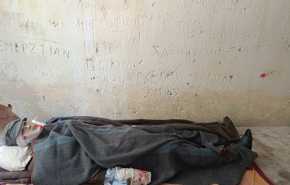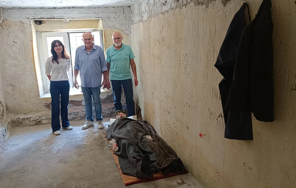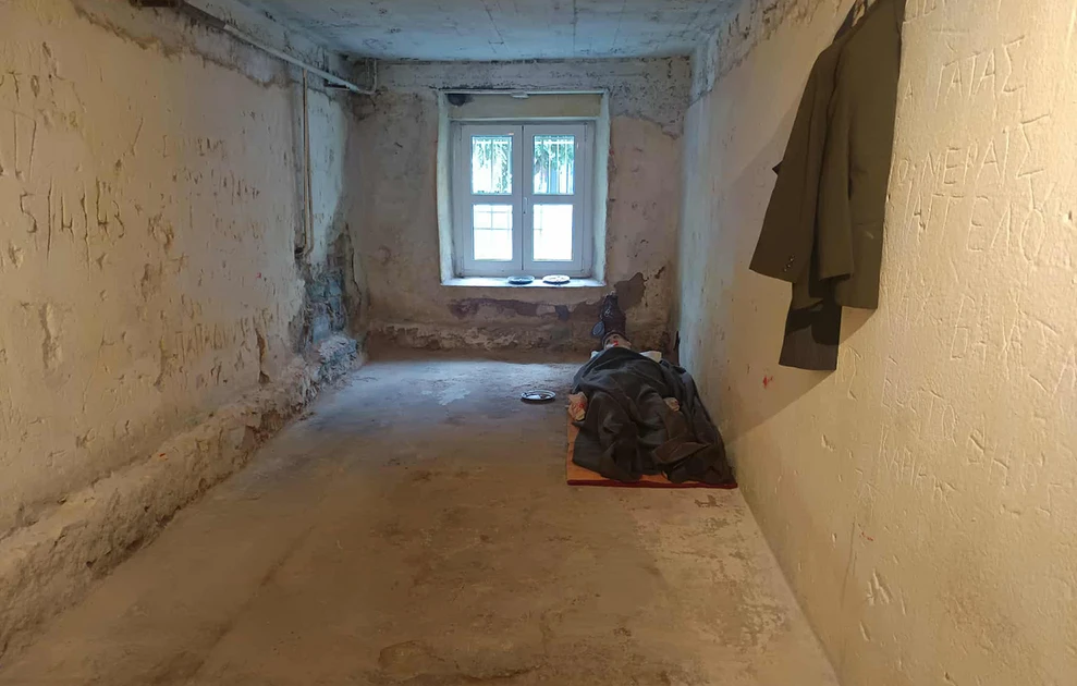 Όλα στον χώρο θυμίζουν το τότε… «Λέρωσα τα μέρη του υπογείου, την πόρτα και το παράθυρο, όπου ακουμπούσαν οι κρατούμενοι. Ζωγράφισα μούχλα στις γωνίες, έβαλα και μερικές σταγόνες αίμα κι έξυσα τα ονόματα που δεν φαινόταν πολύ καλά. Είχα την ελπίδα να βρω στο χώρο ένα εβραϊκό όνομα, αλλά δεν υπήρχε. Μόνο ελληνικά κι ένα αρμένικο», δηλώνει στο Αθηναϊκό-Μακεδονικό Πρακτορείο Ειδήσεων ο Βασίλης Νικόλτσιος.