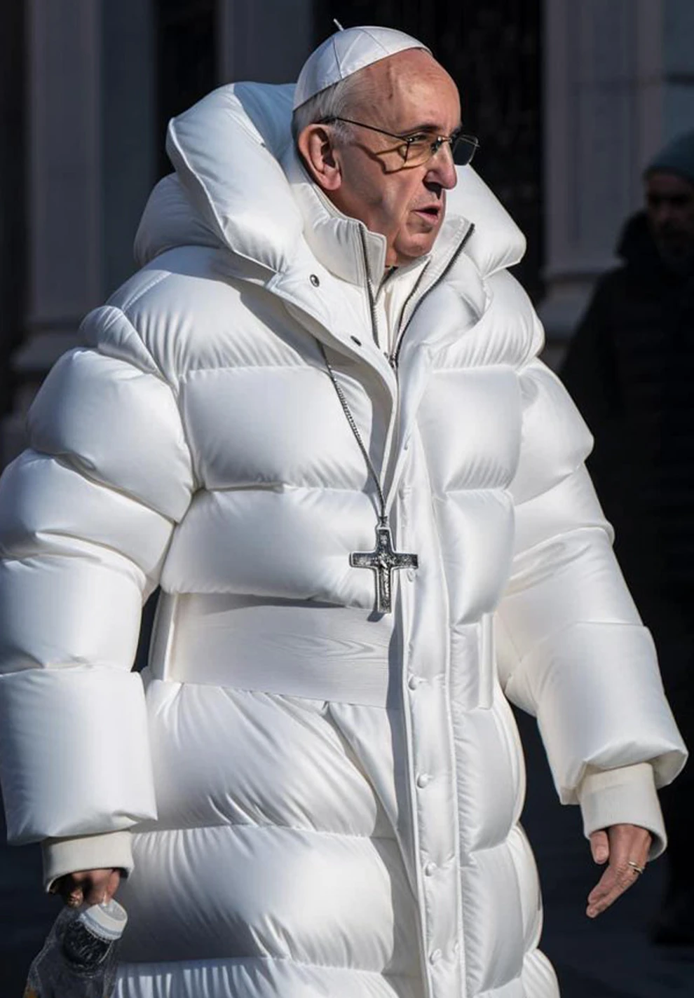 Αν κάποιος κοιτάξει προσεκτικά, μπορεί να παρατηρήσει περίεργες λεπτομέρειες που προδίδουν πως είναι ψεύτικη, όπως η απόχρωση του δέρματος, το χέρι που κρατάει τον καφέ και χάνεται ή το φούσκωμα στη μία πλευρά του μπουφάν. Ωστόσο, η φωτογραφία έγινε viral με την πλειοψηφία του κόσμου να θεωρεί ότι είναι αληθινή.