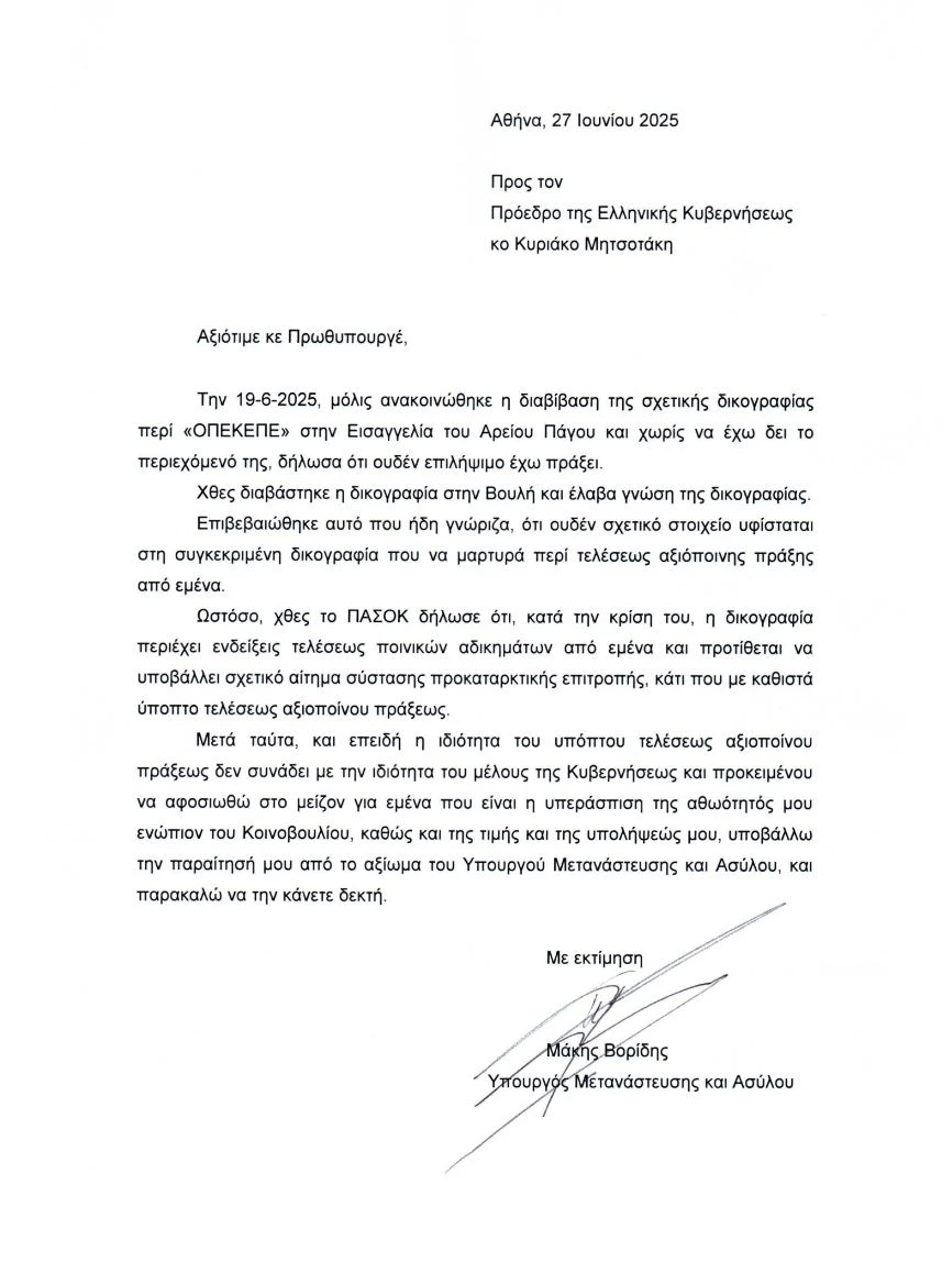 Στην ανακοίνωσή του ο κυβερνητικός εκπρόσωπος αναφέρει: «Ανακοινώνεται ότι ο Υπουργός Μετανάστευσης και Ασύλου Μάκης Βορίδης υπέβαλε την παραίτησή του στον Πρωθυπουργό, για τους λόγους που αναφέρονται στην επιστολή και η οποία επισυνάπτεται. Ο Πρωθυπουργός έκανε δεκτή την παραίτησή του.