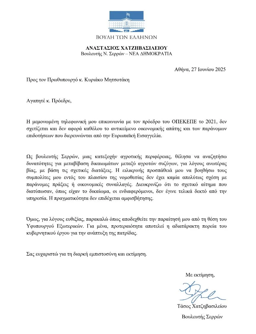 Η επιστολή παραίτησης του Μάκη Βορίδη: