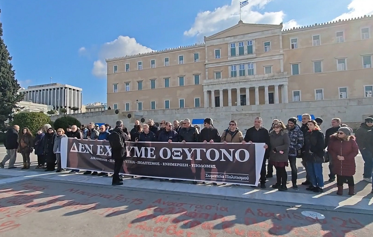 Ένα πανό με το σύνθημα «Δεν έχουμε οξυγόνο» για τα Τέμπη, σήκωσαν τα σωματεία πολιτισμού έξω από τη Βουλή κατά τη διάρκεια της ψηφοφορίας για τον νέο Πρόεδρο της Δημοκρατίας.