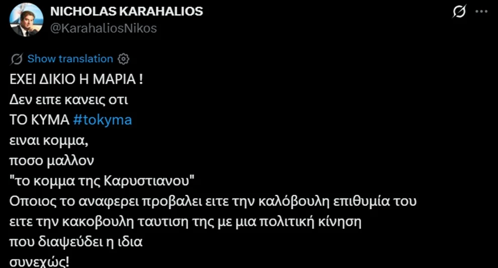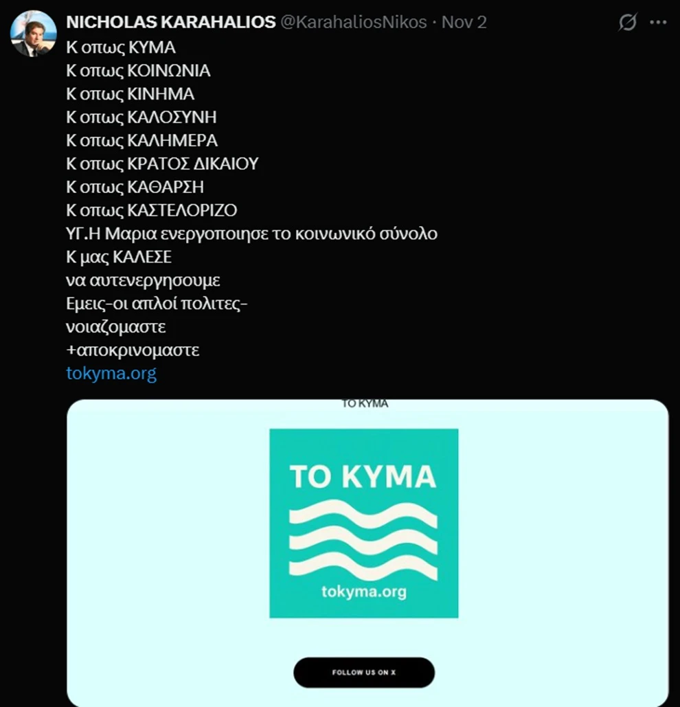 Η ατμόσφαιρα γύρω από τις πρόσφατες δηλώσεις για νέο πολιτικό φορέα συνεχίζει να προκαλεί αντιδράσεις, μετά τις φήμες που κυκλοφόρησαν χθες μέσω ανάρτησης του Νίκου Καραχάλιου. Ο ίδιος, που ανήκει στον στενό κύκλο επαφών της Μαρίας Καρυστιανού, παρουσίασε στο Twitter ένα λογότυπο και την ονομασία «Το Κύμα», αφήνοντας να εννοηθεί μια σύνδεση με το όνομα «Μαρία», προκαλώντας ποικίλα σχόλια και εικασίες.