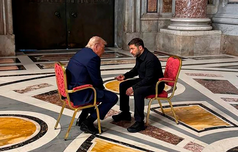 Ο Ζελένσκι βρίσκονταν επίσης στην ίδια σειρά με τον Τραμπ. Λίγο πριν ξεκινήσει η κηδεία μάλιστα, οι δύο ηγέτες φωτογραφήθηκαν να έχουν μια έντονη και εις βάθος συζήτηση.