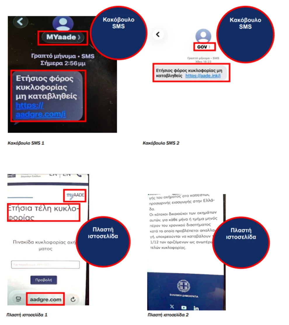 Τα μηνύματα αυτά, με την πρόφαση «μη καταβληθέντος ετήσιου φόρου κυκλοφορίας», ζητούν από τους παραλήπτες να πατήσουν σε σύνδεσμο (link) για να πληρώσουν δήθεν τέλη κυκλοφορίας οχημάτων.