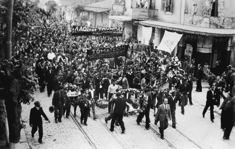 Το 1936, στη Θεσσαλονίκη, είναι η σειρά των καπνεργατών. Μέσα σε λίγες ημέρες, η απεργία εξαπλώνεται σε όλη τη βόρεια Ελλάδα. Στις 9 Μαΐου, ο Τάσος Τούσης πέφτει νεκρός στη Βενιζέλου. Η φωτογραφία της μάνας του, σκυμμένη πάνω από το νεκρό σώμα, ενέπνευσε στον Γιάννη Ρίτσο τον «Επιτάφιο».