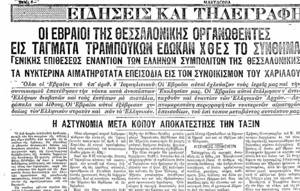 1931: Η εθνικιστική παραστρατιωτική οργάνωση Εθνική Ένωσις Ελλάς (ΕΕΕ) εξαπολύει πογκρόμ κατά των Εβραίων κατοίκων του συνοικισμού Κάμπελ στη Θεσσαλονίκη, έπειτα από ασήμαντη συμπλοκή με νεαρούς Έλληνες χριστιανούς. Η εφημερίδα «Μακεδονία», με συνεχή και υποκινητικά άρθρα, φανάτιζε την κοινή γνώμη, παρουσιάζοντας τους Εβραίους ως εχθρούς της κοινωνίας.