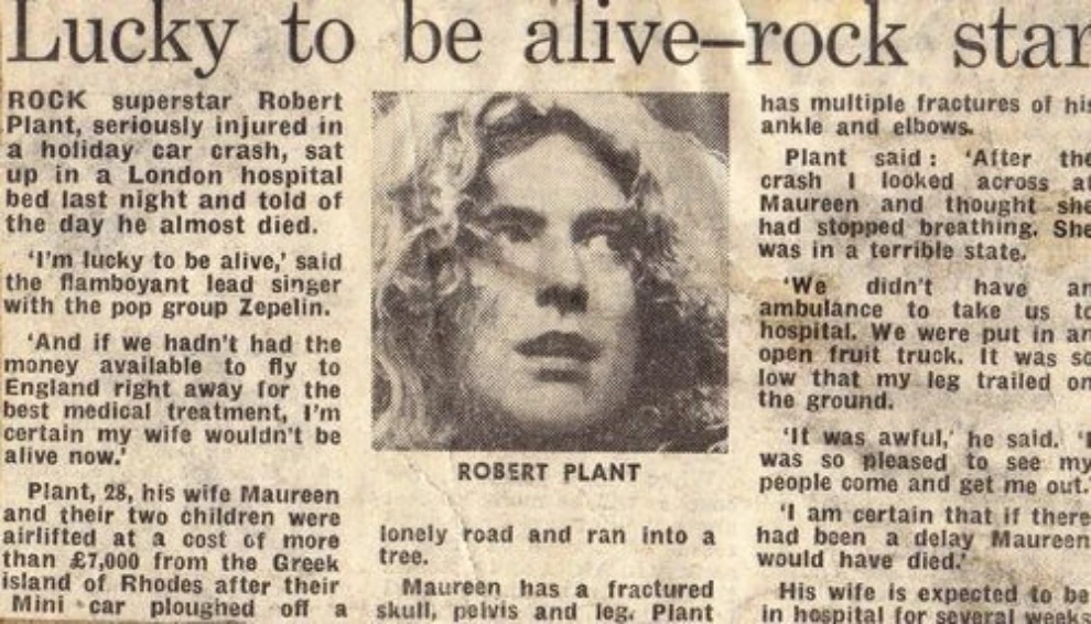 1975: Ο Ρόμπερτ Πλαντ, εμβληματικός τραγουδιστής των Led Zeppelin, και η σύζυγός του τραυματίζονται σοβαρά σε τροχαίο ατύχημα στη Ρόδο, κατά τη διάρκεια διακοπών τους στο νησί. Ο Πλαντ παθαίνει πολλαπλά κατάγματα στο πόδι και υποβάλλεται σε πολυήμερη νοσηλεία, γεγονός που αναγκάζει το συγκρότημα να διακόψει την παγκόσμια περιοδεία του και να ματαιώσει σειρά εμφανίσεων σε Ευρώπη και Αμερική.