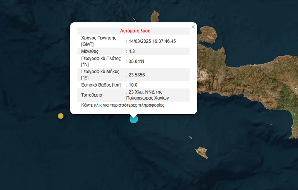 Δυο σεισμικές δονήσεις καταγράφηκαν νωρίτερα στην Κρήτη. Σύμφωνα με το Γεωδυναμικό Ινστιτούτο, η πρώτη καταγράφηκε στις 15:40 με μέγεθος 4,8 βαθών της κλίμακας ρίχτερ, 74 Χλμ. ΝΝΔ της Χρυσής Λασιθίου και εστιακό βάθος 32.5 χιλιόμετα.
