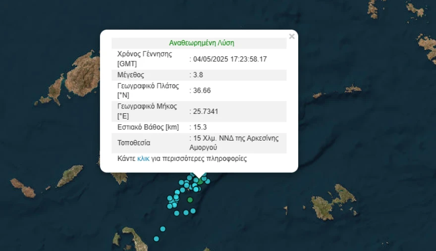 Σύμφωνα με το Γεωδυναμικό Ινστιτούτο, το επίκεντρο του σεισμού εντοπίζεται στα 15 χιλιόμετρα νότια – νοτιοδυτικά της Αρκεσίνης Αμοργού, ενώ το εστιακό βάθος εντοπίστηκε στα 15,3 χιλιόμετρα.