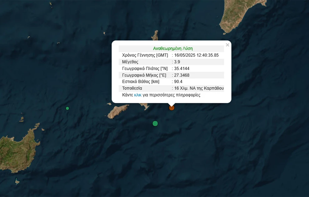 Σεισμός 3,9 Ρίχτερ σημειώθηκε νωρίς το απόγευμα της Παρασκευής 16 Μαΐου, σε θαλάσσια περιοχή, στα 19 χιλιόμετρα, νότια της Καρπάθου.