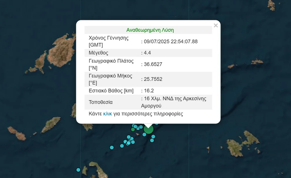Ο σεισμός καταγράφηκε στις 2:54’ 16 χλμ νοτιοδυτικά της Αρκεσίνης Αμοργού με εστιακό βάθος 16,2 χλμ.
