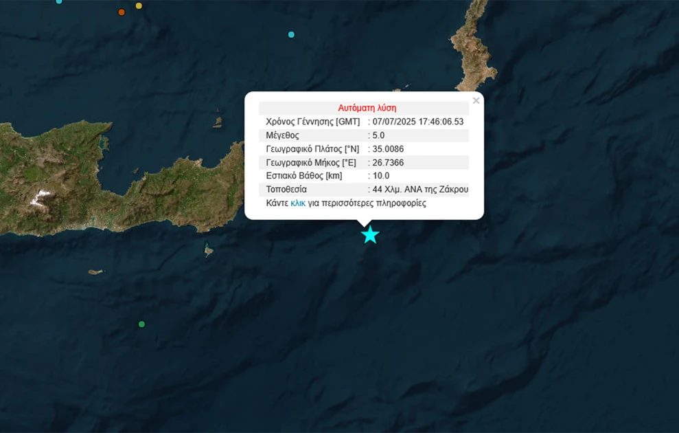 Το επίκεντρο του σεισμού εντοπίζεται 44 χιλιόμετρα ανατολικά – νοτιοανατολικά της Ζάκρου και το εστιακό του βάθος είναι στα 10 χιλιόμετρα.