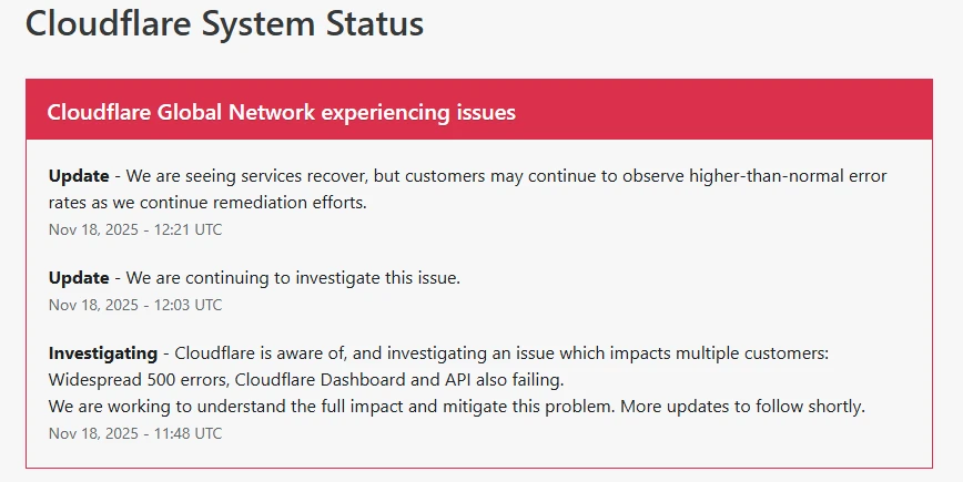 Το Cloudflare δήλωσε λίγο πριν τις 14:00 πως είναι ενήμερο και πως ερευνά ένα πρόβλημα που, όπως αναφέρεται σε ανακοίνωση, «επηρεάζει πολλούς πελάτες» της πλατφόρμας. «Περισσότερες πληροφορίες θα ανακοινωθούν μόλις γίνουν διαθέσιμες», έγραψε η εταιρεία, η οποία, σε νεότερη ενημέρωσή της, λίγα λεπτά μετά τις 14:00, έγραψε πως εξακολουθεί να διερευνά το πρόβλημα.