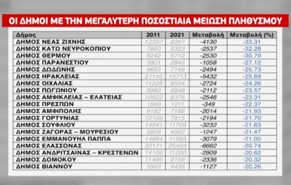Ποιοι είναι οι 19 δήμοι με τη μεγαλύτερη ποσοστιαία μείωση πληθυσμού