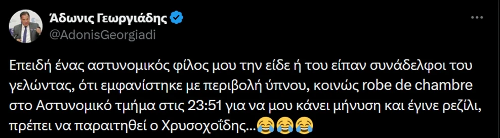 Ο Άδωνις Γεωργιάδης αντέδρασε μέσω ανάρτησης, σχολιάζοντας τα όσα είπε η Ζωή Κωνσταντοπούλου και γράφοντας: «Επειδή ένας αστυνομικός φίλος μου την είδε ή του είπαν συνάδελφοι του γελώντας, ότι εμφανίστηκε με περιβολή ύπνου, κοινώς robe de chambre στο Αστυνομικό τμήμα στις 23:51 για να μου κάνει μήνυση και έγινε ρεζίλι, πρέπει να παραιτηθεί ο Χρυσοχοΐδης…» ενώ συνόδευσε το σχόλιό του με γέλια.