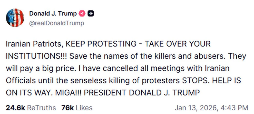 Ο Τραμπ δήλωσε προηγουμένως ότι οι ΗΠΑ θα αναλάβουν «πολύ ισχυρή δράση» εάν η κυβέρνηση του Ιράν προβεί σε απαγχονισμούς διαδηλωτών, χωρίς όμως να υπεισέλθει σε περαιτέρω διευκρινίσεις.