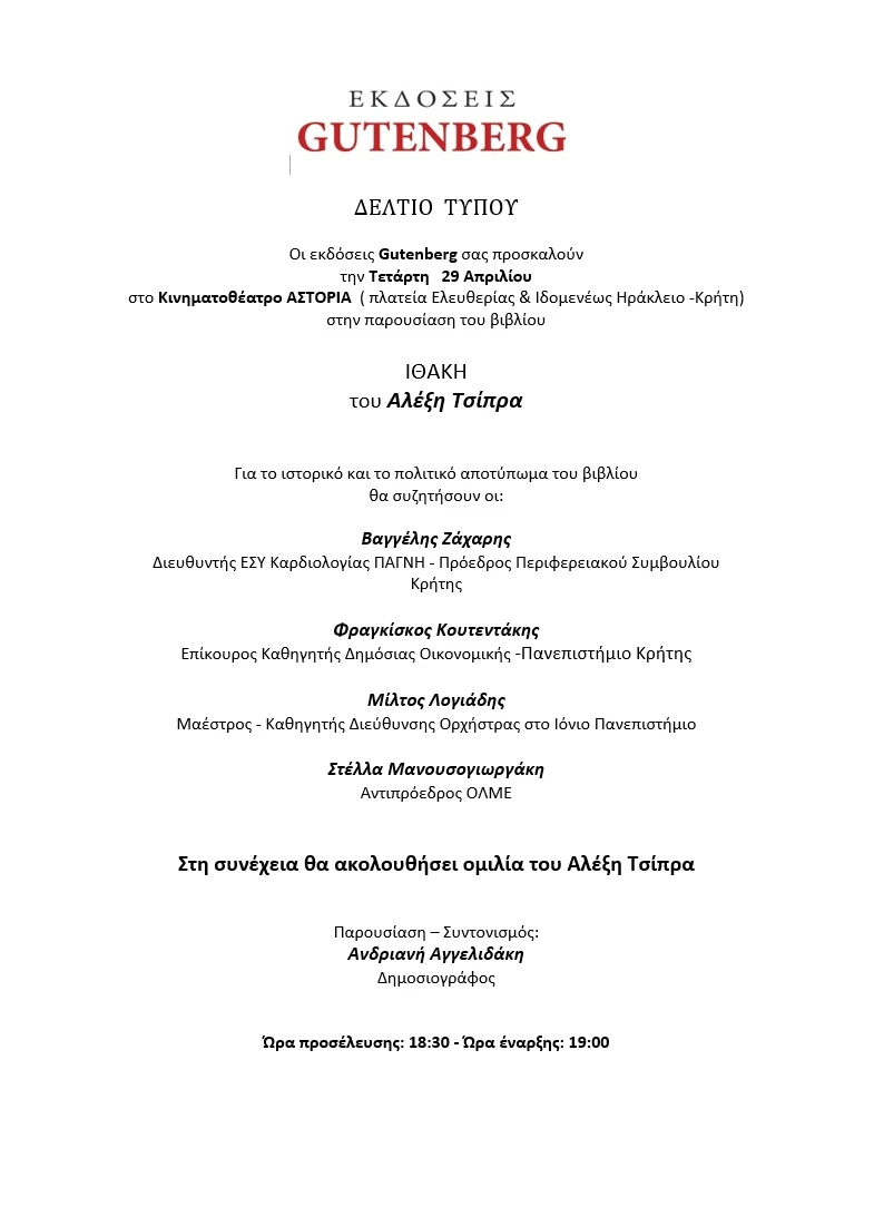 Μια βραδιά πολιτικού και ιστορικού ενδιαφέροντος αναμένεται στο Ηράκλειο, με αφορμή την παρουσίαση του νέου βιβλίου του Αλέξη Τσίπρα, «ΙΘΑΚΗ».