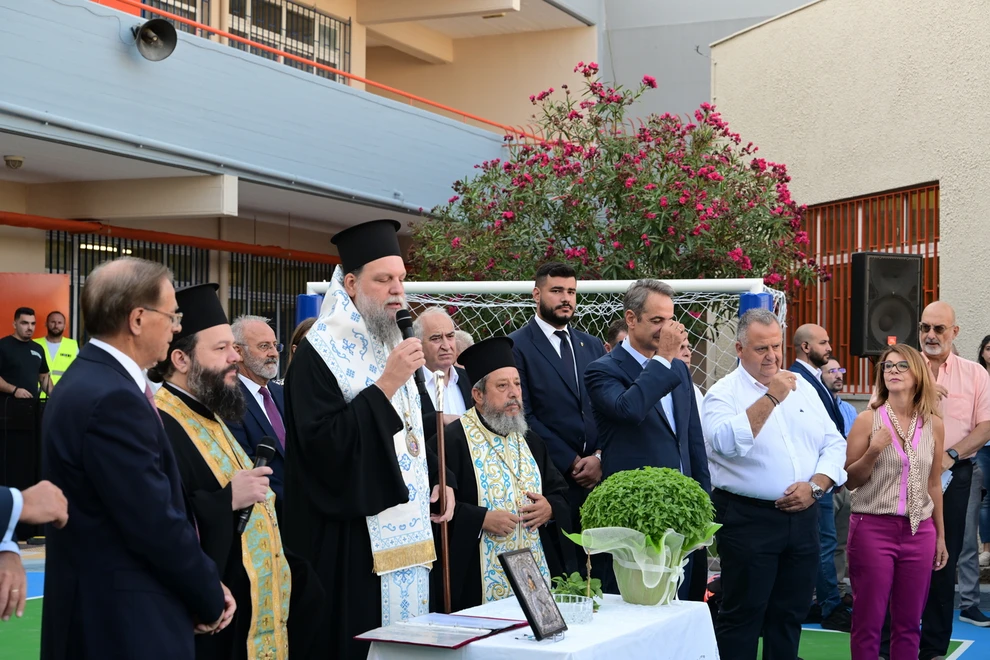 Ο πρωθυπουργός παρέστη στον αγιασμό που τελέστηκε από τον Μητροπολίτη Νέας Ιωνίας, στην αυλή του σχολείου.
