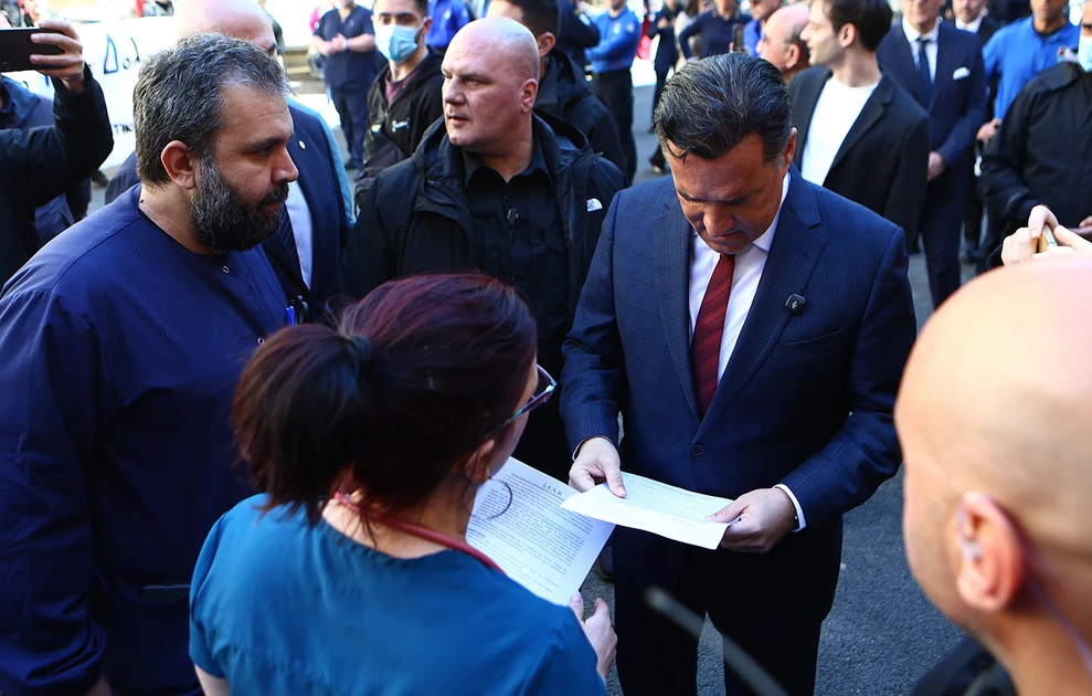 Με συγκέντρωση διαμαρτυρίας και συνθήματα υποδέχθηκαν οι εργαζόμενοι του νοσοκομείου «Παμμακάριστος» τον υπουργό Υγείας, Άδωνι Γεωργιάδη, κατά τη διάρκεια των εγκαινίων του ανακαινισμένου Τμήματος Επειγόντων Περιστατικών (ΤΕΠ).