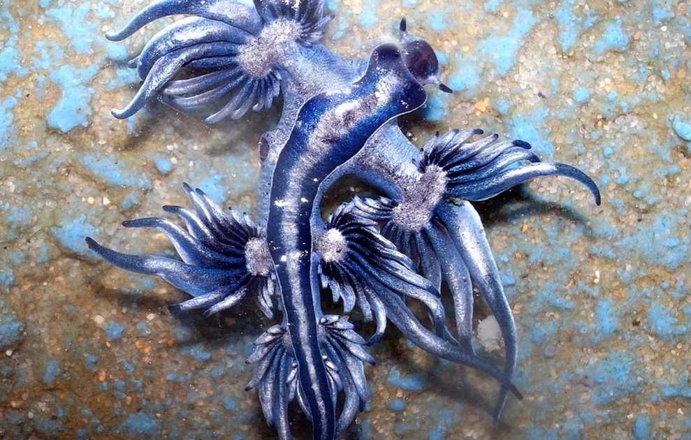 Το θαλάσσιο γυμνοβράγχιο, γνωστό ως Glaucus atlanticus, τρέφεται με τη θανατηφόρα «πορτογαλική καραβέλα» (Portuguese man o’ war) και άλλα δηλητηριώδη θαλάσσια όντα. Το εκθαμβωτικό μπλε πλάσμα απορροφά τα κεντριά από την τροφή του και τα αποθηκεύει σε συμπυκνωμένη μορφή, αποκτώντας πολύ πιο ισχυρό τσίμπημα από το ίδιο του το θήραμα.