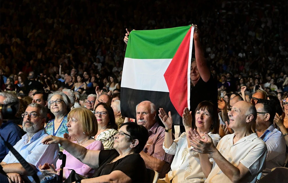 Σε όλο το Στάδιο ήχησε το σύνθημα «Λευτεριά στην Παλαιστίνη», από τις οθόνες πρόβαλε ο Μίκης σε φωτογραφίες με τον Γιασέρ Αραφάτ και τον Γιάννη Ρίτσο, να φορούν την παλαιστινιακή μαντίλα, ενώ το κοινό ανέμιζε κεφίγες και παλαιστινιακές σημαίες, κοιτώντας τη μια εξέδρα όπου εκατοντάδες νέοι ύψωσαν πικέτες με τη σημαία της Παλαιστίνης.
