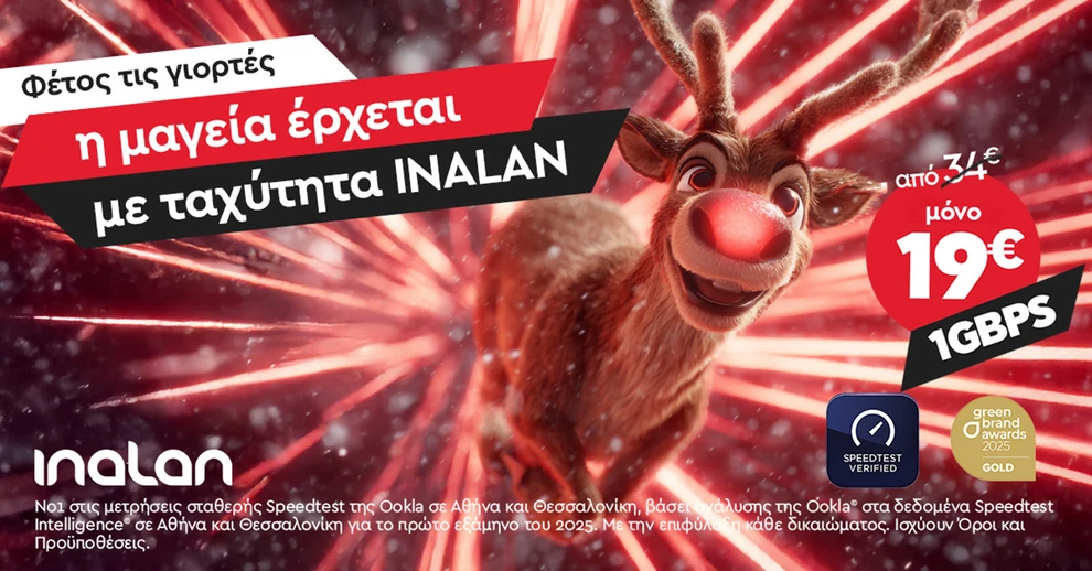 Φέτος τα Χριστούγεννα, η INALAN προσφέρει 1Gbps στα 19€ και κάνει αυτή τη σύνδεση προσιτή σε κάθε σπίτι. Γιατί η τεχνολογία αποκτά αξία μόνο όταν γίνεται γέφυρα. Και κάθε γέφυρα έχει έναν σκοπό: να φέρνει ανθρώπους πιο κοντά.