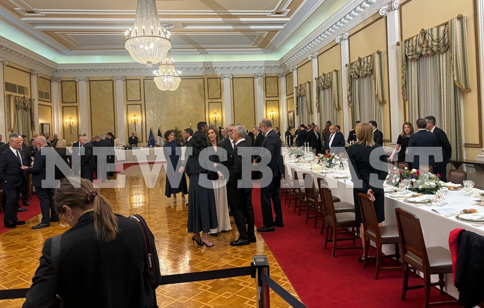 Μου είπαν ότι το ζεύγος Μακρόν έμεινε εντυπωσιασμένο από το Προεδρικό Μέγαρο και κυρίως την αρχιτεκτονική του. Έμαθα ότι υπήρξαν και πολύ καλά σχόλια για το μενού της δεξίωσης που επιμελήθηκε ο σεφ της Προεδρίας Βασίλης Μπέκας και είχε, φυσικά, έντονο ελληνικό χρώμα. Αν έχετε απορία τι έφαγαν θα σας αναφέρω: σούπα βελουτέ σελινόριζας με τηγανητό πράσο και λάδι αρωματισμένο με τρούφα, φιλέτο καραβίδας με μους μελιτζάνας με χυμό φρέσκιας ντομάτας, φύλλα βασιλικού και κατίτι Δομοκού, Αιγαιοπελαγίτικο φαγκρί γεμιστό με σπανάκι, δυόσμο και σάλτσα από ανθό λεμονιού, χειροποίηση γαλατόπιτα Θεσσαλίας με σάλτσα βανίλιας, άρωμα κανέλας και σταφίδας, φρούτα εποχής. Τι ήπιαν; Η κάβα είχε ροζέ Domaine Costa Lazaridi, του 2025, λευκό Le Roi des Montagnes Assyrtiko και επιδόρπιο Vinsanto. Οσο για τη μουσική άκουσαν από την μπάντα του Πολεμικού Ναυτικού, ελληνικές και γαλλικές συνθέσεις των Εντίθ Πιάφ και Σαρλ Αζναβούρ. Συγκινητική στιγμή η ανάκρουση των εθνικών ύμνων Ελλάδας και Γαλλίας, ενώ την έναρξη του δείπνου μετά την προσφώνηση και αντιφώνηση κήρυξαν με τα τσουγκρίσματα των ποτηριών.