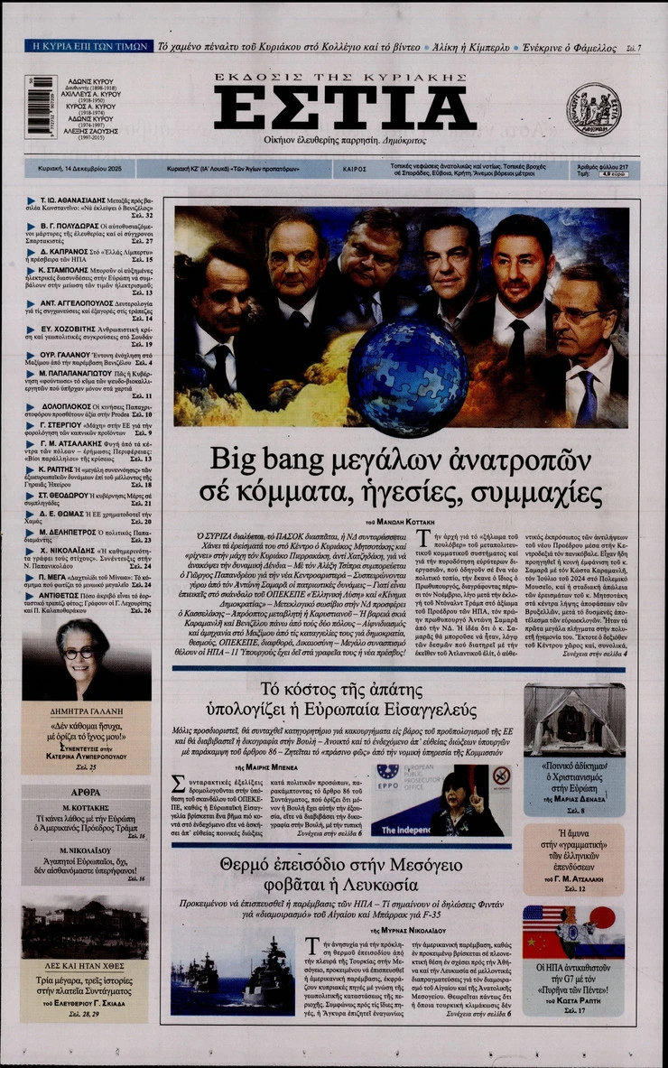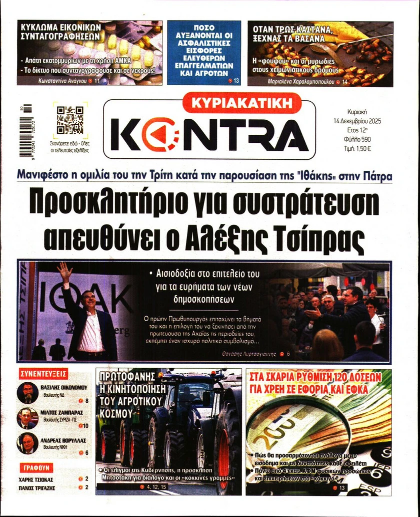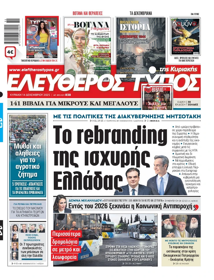 Οι κινητοποιήσεις των αγροτών, το δόγμα του Ντόναλντ Τραμπ για την Ευρώπη και πώς επηρεάζει την Ελλάδα η νέα στρατηγική του Λευκού, η νόμιμη μετανάστευση με βίζα και άδεια εργασίας για δύο χρόνια που εξετάζεται από την κυβέρνηση και όλα όσα αλλάζουν σε διαθήκες και περιουσιακές διακδικήσεις ξεχωρίζουν στα πρωτοσέλιδα των κυριακάτικων εφημερίδων.