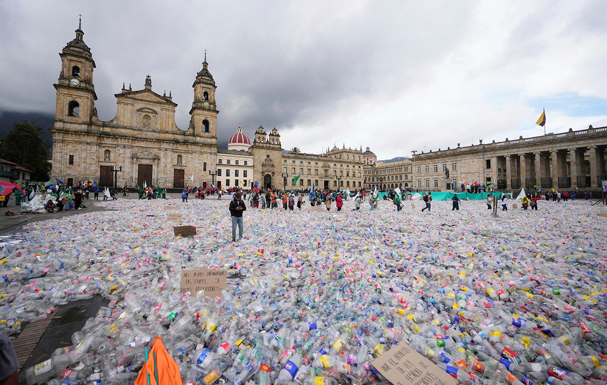 Πλημμύρισε με πλαστικά μπουκάλια η πλατεία Μπολιβάρ στην Κολομβία: Διαμαρτυρία από συλλέκτες απορριμάτων