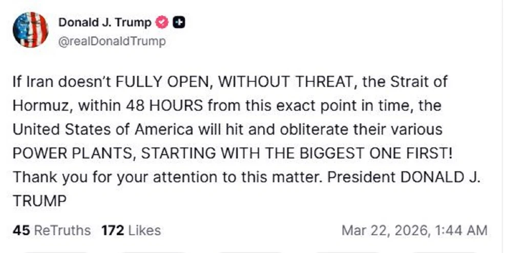 «Εάν το Ιράν δεν ΑΝΟΙΞΕΙ ΠΛΗΡΩΣ, ΧΩΡΙΣ ΑΠΕΙΛΕΣ, το Στενό του Ορμούζ, εντός 48 ΩΡΩΝ από αυτή ακριβώς τη στιγμή, οι Ηνωμένες Πολιτείες της Αμερικής θα χτυπήσουν και θα καταστρέψουν τα διάφορα ΕΡΓΟΣΤΑΣΙΑ ΠΑΡΑΓΩΓΗΣ ΗΛΕΚΤΡΙΚΗΣ ΕΝΕΡΓΕΙΑΣ τους, ΞΕΚΙΝΩΝΤΑΣ ΠΡΩΤΑ ΑΠΟ ΤΟ ΜΕΓΑΛΥΤΕΡΟ!».