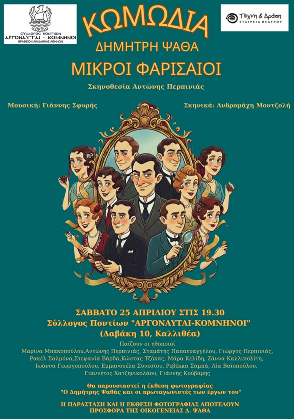 Ο Πρόεδρος του Συλλόγου Ποντίων «Αργοναύται-Κομνηνοί» Θεόφιλος Καστανίδης και η εγγονή του Δημήτρη Ψαθά, Λένα Νίτσου-Ψαθά εγκαινιάζουν τον «Έβδομο μήνα θεάτρου – Έν αρχή ήν ο λόγος» με ένα αφιέρωμα στον αξέχαστο θεατρικό συγγραφέα και ταυτόχρονα προσκαλούν το κοινό να παρακολουθήσει την ξεκαρδιστική κωμωδία του «Μικροί Φαρισαίοι» καθώς και την έκθεση φωτογραφίας «Ο Δημήτρης Ψαθάς και οι πρωταγωνιστές των έργων του» το ερχόμενο Σάββατο 25 Απριλίου, στην Αίθουσα Εκδηλώσεων του Σύλλογου Ποντίων «Αργοναύται – Κομνηνοί» με ελεύθερη είσοδο για το κοινό.
